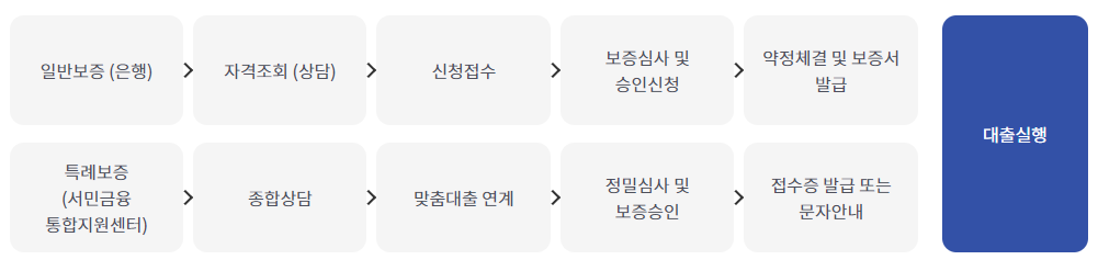 이용절하는 아래와 같이 일반보증(은행) 과 특례보증 (서민금융통합지원센터) 로 나뉘어 진행합니다.
